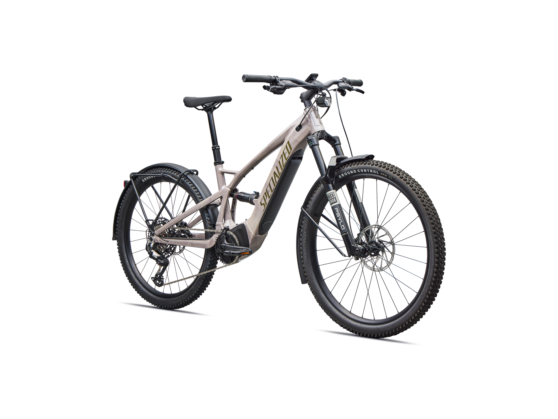 - Quadro - E5 Aluminum, full suspension, mullet style for M-XL, bottom bracket motor mount, fully integrated & lockable downtube battery, internal cable routing, lock and front rack mount