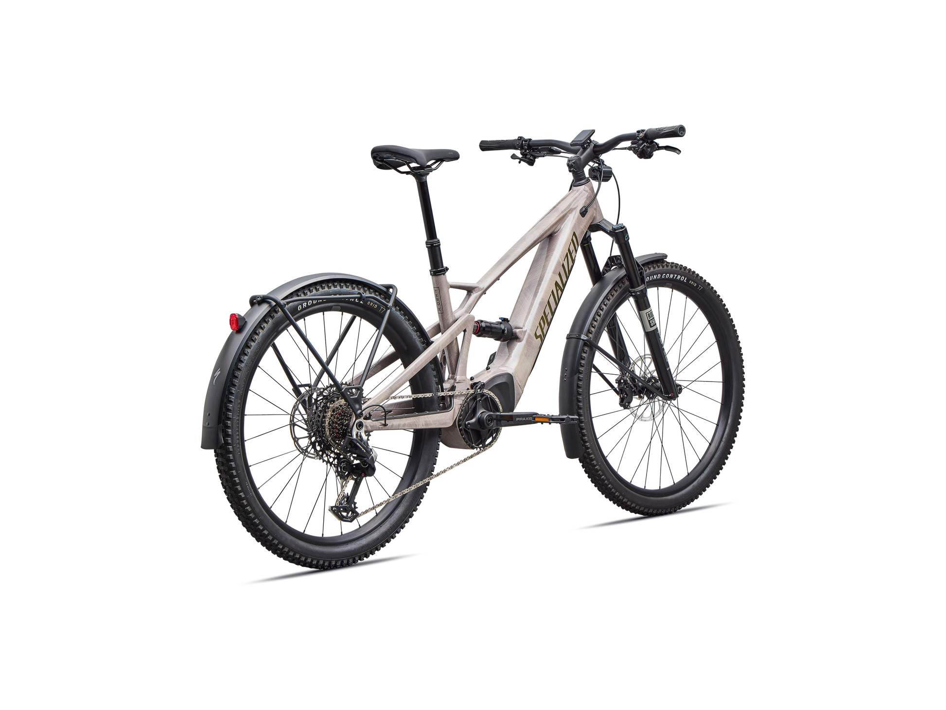 - Quadro - E5 Aluminum, full suspension, mullet style for M-XL, bottom bracket motor mount, fully integrated & lockable downtube battery, internal cable routing, lock and front rack mount