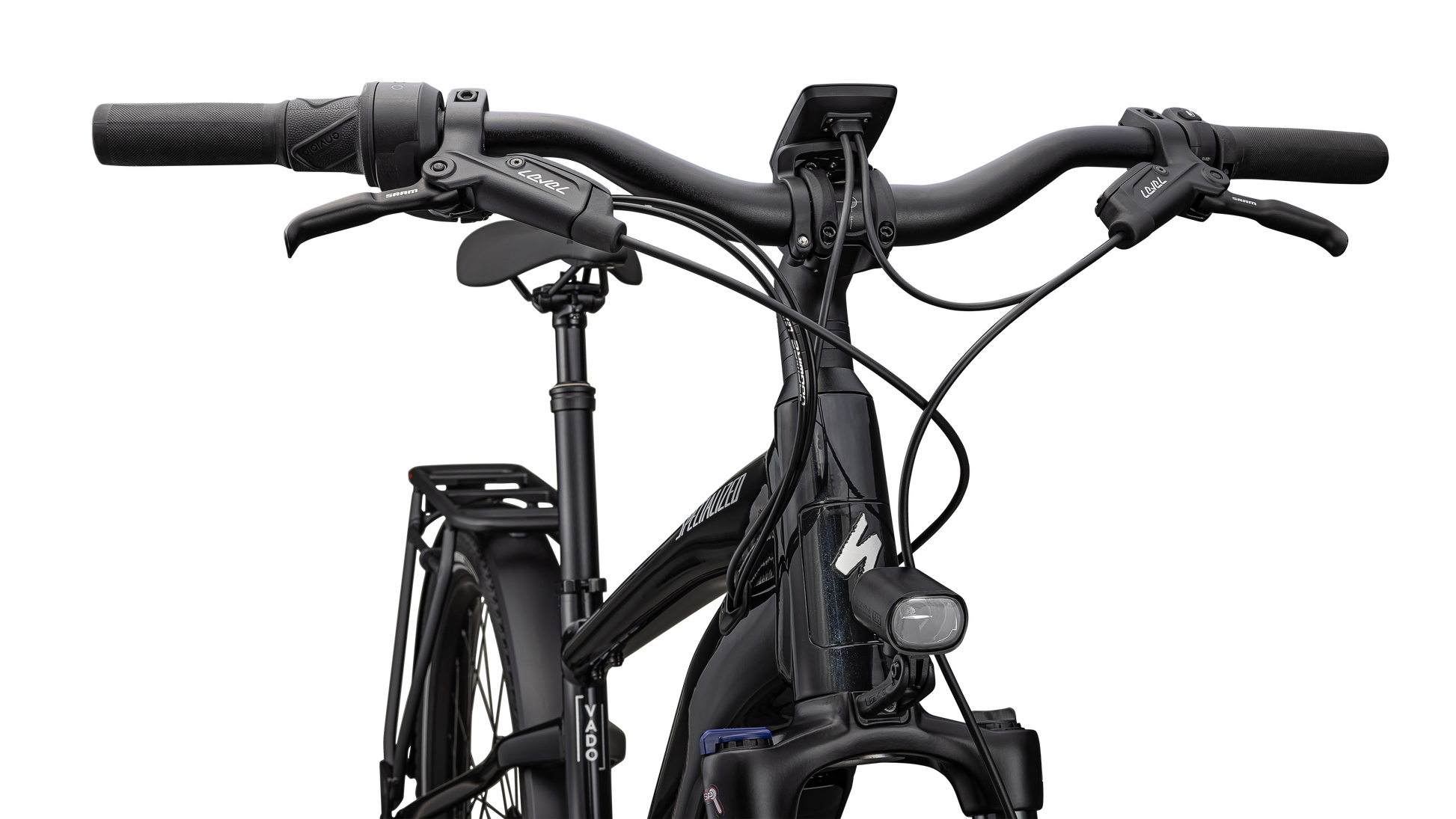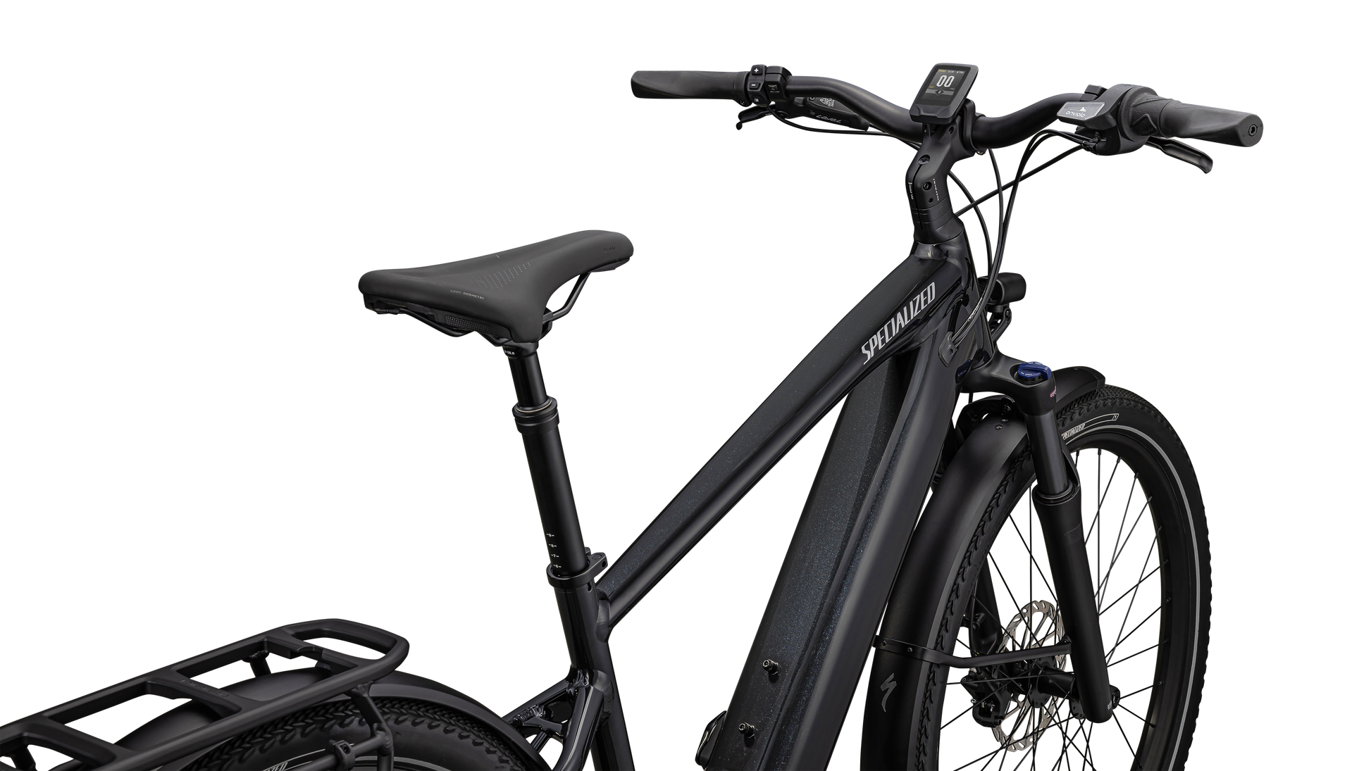 - Quadro - E5 Aluminum, bottom bracket motor mount, fully integrated & lockable downtube battery, internal cable routing, lock and front rack mount, sliding dropout